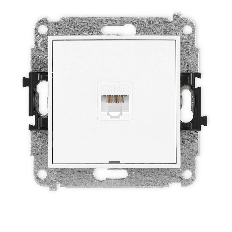 Gniazdo komputerowe z jednym wejściem RJ45, które służy do podłączenia przewodu sieciowego. Obsługuje kategorię 5e, co pozwala na szybki i stabilny transfer danych w domowej lub biurowej sieci internetowej. Dzięki niemu można podłączyć komputer, router czy inne urządzenie wymagające dostępu do Internetu przewodowego.