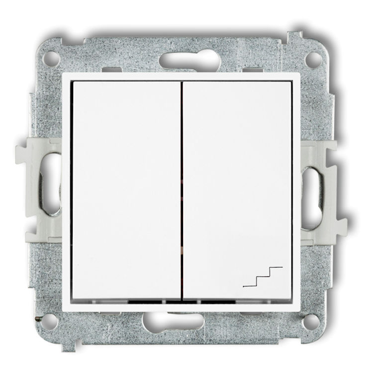 Łącznik z dwoma klawiszami, który pozwala sterować dwoma różnymi obwodami oświetleniowymi. Jeden klawisz działa jak zwykły włącznik światła, a drugi pełni funkcję łącznika schodowego, umożliwiając sterowanie tym samym światłem z dwóch miejsc, np. na początku i końcu korytarza.
