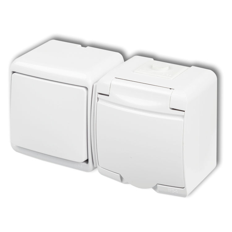 Praktyczne połączenie łącznika jednobiegunowego z pojedynczym gniazdem z uziemieniem, które umożliwia jednoczesne sterowanie oświetleniem i podłączenie urządzenia elektrycznego w jednym miejscu. Wyposażone jest w białą klapkę ochronną, chroniącą przed kurzem i przypadkowym dotknięciem styków.