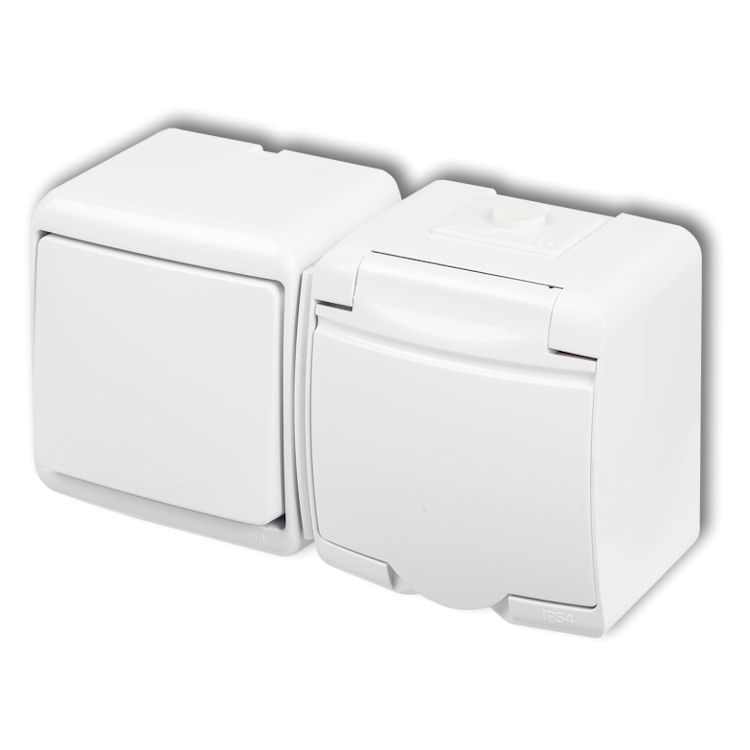 Połączenie łącznika jednobiegunowego z pojedynczym gniazdem z uziemieniem, które pozwala w jednym miejscu sterować oświetleniem i zasilać urządzenie elektryczne. Wyposażone jest w białą klapkę ochronną oraz przesłony torów prądowych, które zwiększają bezpieczeństwo użytkowania.
